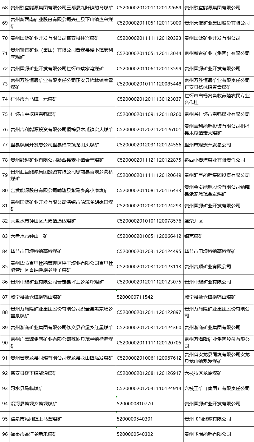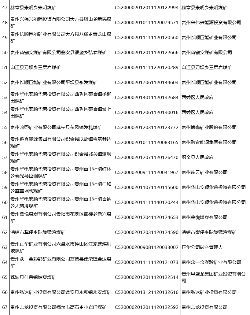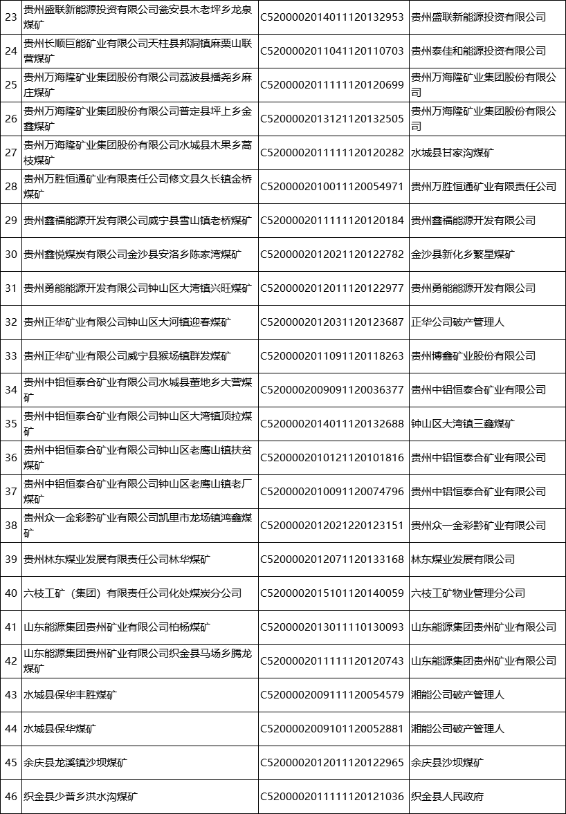 公告指出,根據(jù)《礦產(chǎn)資源開采登記管理辦法》《國土資源部關(guān)于完善礦產(chǎn)資源開采審批登記管理有關(guān)事項(xiàng)的通知》《自然資源部辦公廳關(guān)于政策性關(guān)閉礦山采礦許可證注銷有關(guān)工作的函》《貴州省自然資源廳 貴州省能源局關(guān)于已關(guān)閉煤礦限期注銷采礦許可證的公告》,對(duì)已按照《省人民政府關(guān)于煤炭工業(yè)淘汰落后產(chǎn)能加快轉(zhuǎn)型升級(jí)的意見》(黔府發(fā)〔2017〕9號(hào))、《省人民政府辦公廳關(guān)于轉(zhuǎn)發(fā)省能源局等部門貴州省煤礦企業(yè)兼并重組工作方案(試行)的通知》(黔府辦發(fā)〔2012〕61號(hào))要求完成關(guān)閉的發(fā)耳礦區(qū)水城縣玉舍(西井)煤礦等96個(gè)煤礦予以注銷采礦許可證并公告,責(zé)任主體要履行礦山關(guān)閉后相關(guān)生態(tài)修復(fù)等法定義務(wù),對(duì)于未按承諾完成法定義務(wù)的納入失信聯(lián)合懲戒。