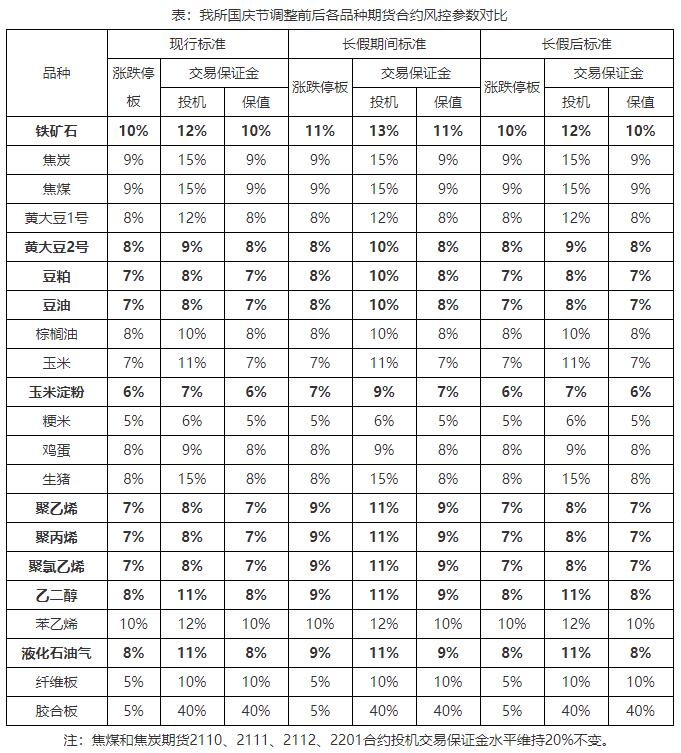 根據(jù)《大連商品交易所風(fēng)險管理辦法》,經(jīng)研究決定,我所將在2021年國慶節(jié)休市前后對各品種期貨合約漲跌停板幅度和交易保證金水平做如下調(diào)整: