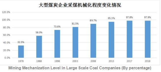 煤炭生產(chǎn)方面,從1978年至2019年,大型煤炭企業(yè)采煤機(jī)械化程度由32%提高到96%;全國煤礦人均生產(chǎn)效率由137噸/年提高到1000噸/年;建成了年產(chǎn)120萬噸及以上的大型現(xiàn)代化煤礦1200處左右,煤炭產(chǎn)量占全國的80%以上;建成了千萬噸級(jí)煤礦42處,產(chǎn)能6.7億噸/年。