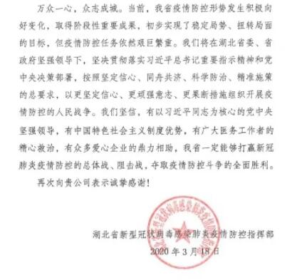 信中寫道:在湖北省抗擊新冠肺炎疫情的關(guān)鍵時刻,貴公司認真貫徹落實習近平總書記重要指示精神和黨中央決策部署,慷慨解囊、奉獻愛心,捐贈善款3000萬元,體現(xiàn)了豈曰無衣、與子同袍的大愛情懷,體現(xiàn)了中央企業(yè)的鐵肩擔當和無私境界,為我們戰(zhàn)勝疫情提供了有力支持和幫助,增添了巨大信心和力量。