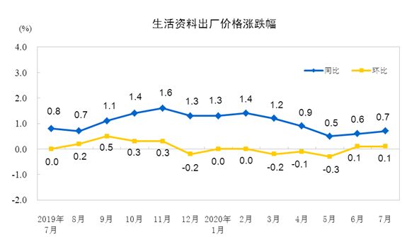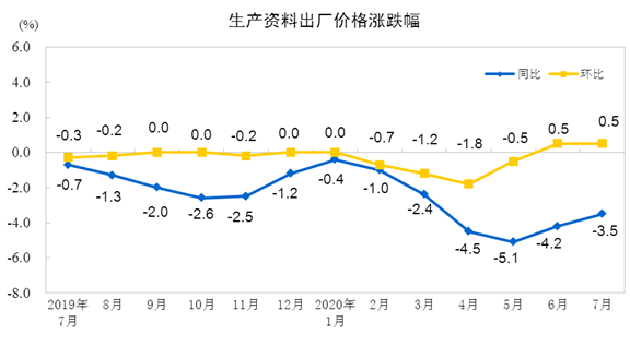 2020年7月份,全國工業(yè)生產(chǎn)者出廠價(jià)格同比下降2.4%,環(huán)比上漲0.4%;工業(yè)生產(chǎn)者購進(jìn)價(jià)格同比下降3.3%,環(huán)比上漲0.9%。1―7月平均,工業(yè)生產(chǎn)者出廠價(jià)格比去年同期下降2.0%,工業(yè)生產(chǎn)者購進(jìn)價(jià)格下降2.7%。