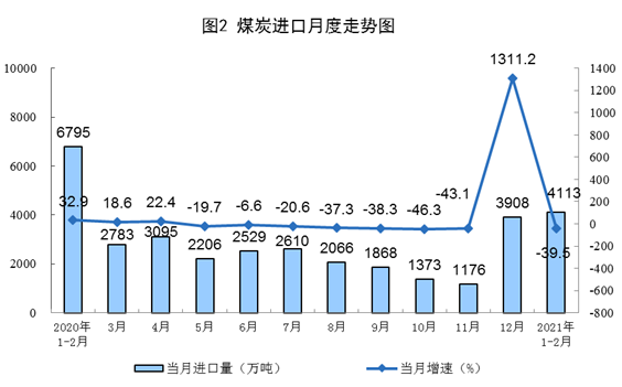 原煤生產(chǎn)同比較快增長(zhǎng),日均環(huán)比略有下降。1-2月份,生產(chǎn)原煤6.2億噸,同比增長(zhǎng)25.0%,比2019年1—2月份增長(zhǎng)17.1%,兩年平均增長(zhǎng)8.2%;日均產(chǎn)量1047萬(wàn)噸,比上年12月份減少88萬(wàn)噸。進(jìn)口煤炭4113萬(wàn)噸,同比下降39.5%。