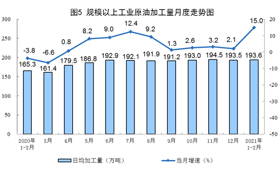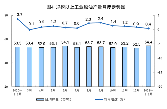 原油生產(chǎn)同比保持穩(wěn)定增長(zhǎng),日均環(huán)比增產(chǎn)。1—2月份,生產(chǎn)原油3208萬(wàn)噸,同比增長(zhǎng)0.4%,比2019年1—2月份增長(zhǎng)4.1%,兩年平均增長(zhǎng)2.0%;日均產(chǎn)量54.4萬(wàn)噸,比上年12月份增加1.9萬(wàn)噸。加工原油11424萬(wàn)噸,同比增長(zhǎng)15.0%,比2019年1—2月份增長(zhǎng)10.6%,兩年平均增長(zhǎng)5.2%;日均加工193.6萬(wàn)噸,比上年12月份增加0.1萬(wàn)噸。