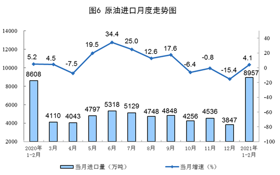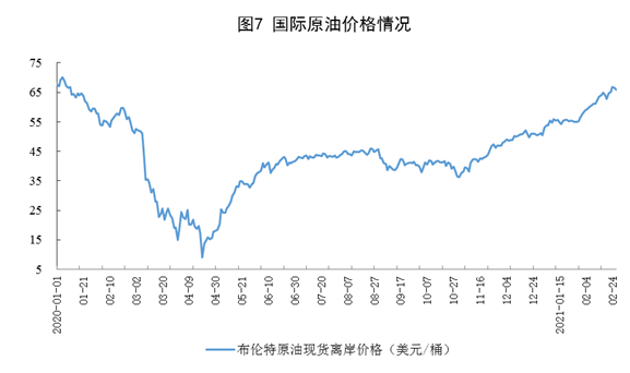 原油進(jìn)口小幅增長(zhǎng),國(guó)際原油價(jià)格持續(xù)上漲。進(jìn)口原油8957萬(wàn)噸,同比增長(zhǎng)4.1%;國(guó)際原油價(jià)格持續(xù)上漲,2月26日布倫特原油現(xiàn)貨離岸價(jià)格為65.86美元/桶,比1月4日50.37美元/桶上漲30.8%。