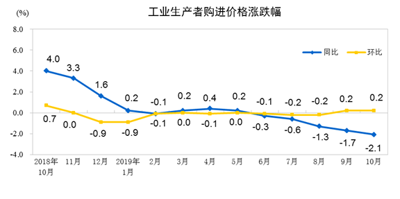 2019年10月份,全國(guó)工業(yè)生產(chǎn)者出廠價(jià)格同比下降1.6%,環(huán)比上漲0.1%;工業(yè)生產(chǎn)者購(gòu)進(jìn)價(jià)格同比下降2.1%,環(huán)比上漲0.2%。1—10月平均,工業(yè)生產(chǎn)者出廠價(jià)格比去年同期下降0.2%,工業(yè)生產(chǎn)者購(gòu)進(jìn)價(jià)格下降0.5%。