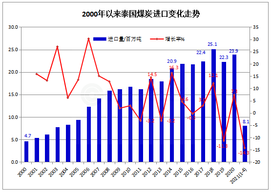 2021年1-4月泰國煤炭進口同比下降14.3%
