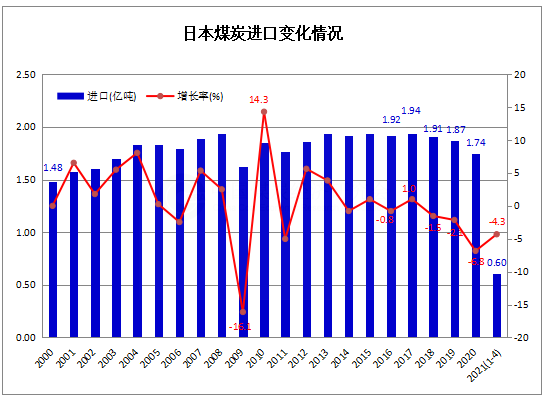 2021年1-4月日本煤炭進口同比下降4.3%