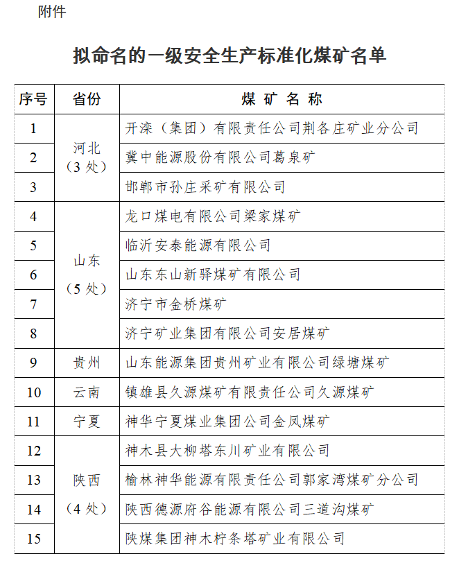 國(guó)家煤礦安監(jiān)局公示擬命名一級(jí)安全生產(chǎn)標(biāo)準(zhǔn)化煤礦共15處